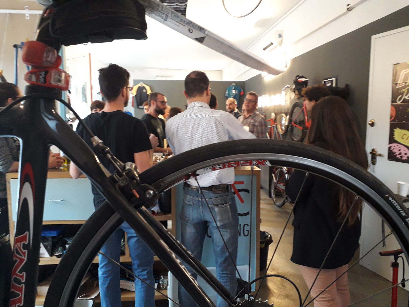 [/vc_column_text][vc_row_inner][vc_column_inner width=”1/2″][vc_column_text]Nella splendida atmosfera del nuovo spazio, con ruote di bicicletta e magliette appese qua e là, giovedì con un piccolo gruppo di amici abbiamo festeggiato una nuova avventura: la ciclofficina Brecycling si è trasferita!
